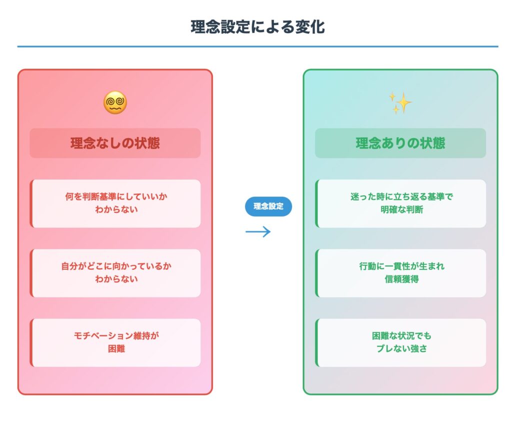 そして、困難な状況でもブレない強さを得られます。理念は精神的な支柱となり、挫折しそうな時に立ち直る力を与えてくれます。
