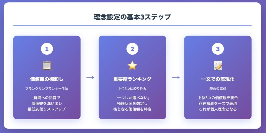 理念が設定できたら、それをさらに体系化していきましょう。次回は、理念を軸としたミッション・ビジョン・バリューの設定法について詳しく解説します。理念からMVVへと発展させることで、より具体的で実践的な人生戦略を構築できるようになります。