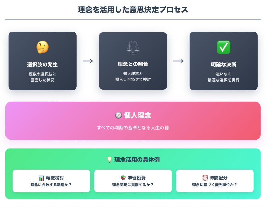 設定した理念は、日常の意思決定において強力なツールとなります。転職を検討する際には「この選択は自分の理念に合致しているか」を自問し、学習投資の優先順位を決める時には「理念実現に最も貢献する分野はどれか」を基準に判断します。理念が明確であれば、迷いなく最適な選択ができるようになります。