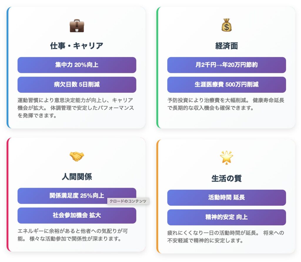 健康への投資がもたらす具体的なメリットを、生活の各場面で実感できる変化として整理しました。