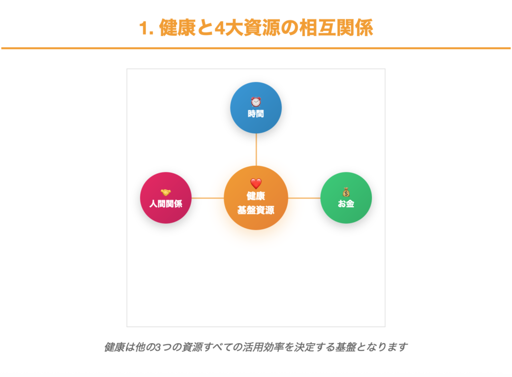中でも健康は他の3つの資源を有効活用するための基盤となる最重要資源です。時間があっても体調が悪ければ有効活用できず、お金があっても健康でなければ楽しめず、人間関係も健康でなければ深く築くことができません。