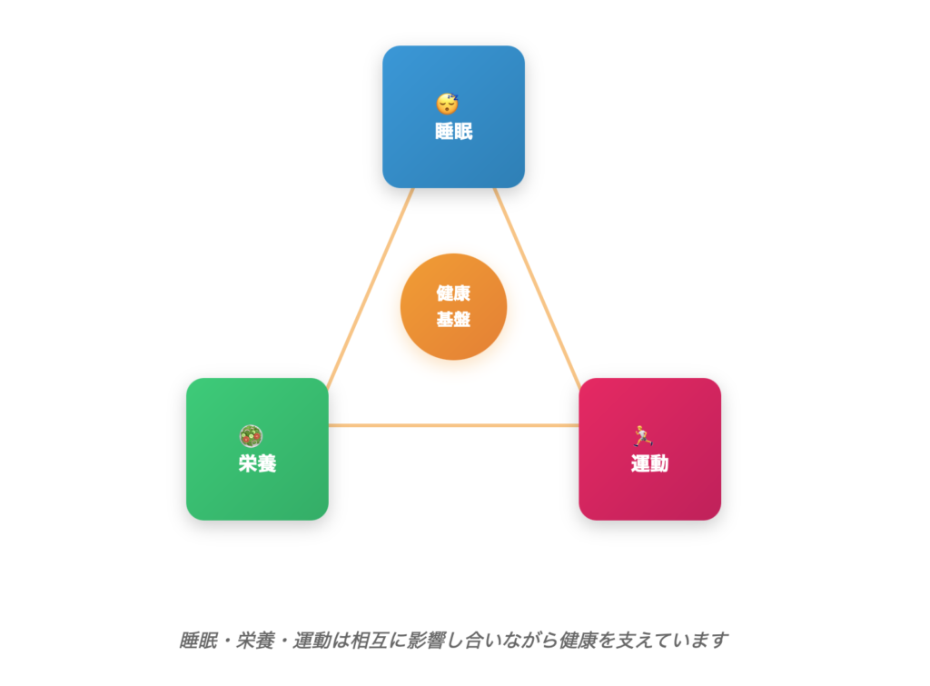 健康維持の基盤となるのは「睡眠・栄養・運動」の3つです。これらはそれぞれが独立して機能するのではなく、相互に影響し合いながら健康を支えています。